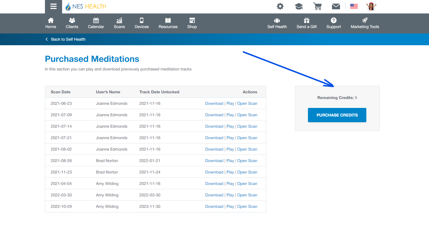 We often get questions on how to unlock personalized meditations and how to find them. After purchasing the first Meditation, you will see the option in your Self Health section. The same is true for your clients if you turn the option on for them in your Scan Screen Settings. Any purchased credit will show up in the portal account of the person who purchased it. For example, if you purchased 5 credits to use you will see this number in the Purchased Meditations in the Self Health section. If your client purchases meditation credits, they will see them in their account.