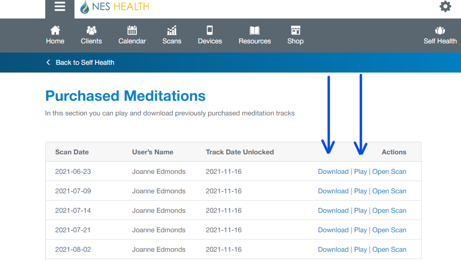 Your clients also have access to Self Health. If you allow the option to listen and purchase Meditations, your clients will see this feature in Self Health.