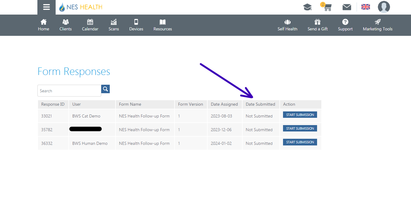 In this example, none of the clients have submitted the form. If the form has been completed, you will be able to view it in the Action column.