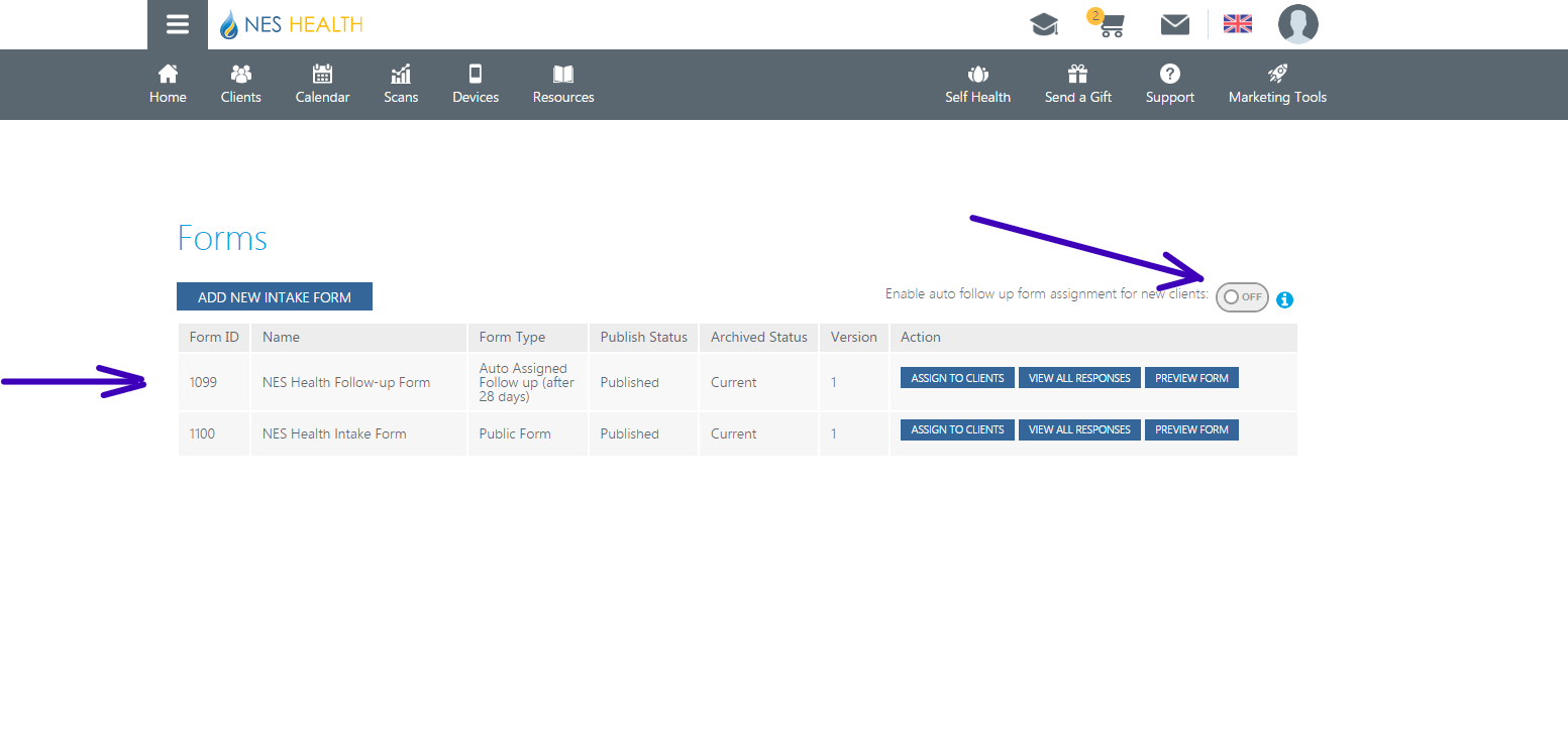 Enabling auto follow-up form assignment will automatically assign the follow-up form for new clients to complete 28 days after their scan. Your client will receive an email notification to complete the form. Follow-up forms are a great way to monitor the progress of your client’s health. You can change whether individual clients have this functionality switched on in their client profile.